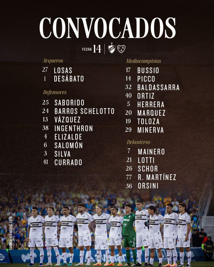 La nómina está compuesta por 23 futbolistas y tiene cuatro modificaciones con relación a la que viene de peder con Independiente. Salen: Gonzalo Goñi (ver parte médico), Franco Zapiola (ver parte médico), Manuel Tucker y Mauro Luna Diale (ver parte médico) e ingresan: Thiago Currado (primera convocatoria en Primera), Nicolás Ortiz, Ignacio Vázquez y Franco Minerva.